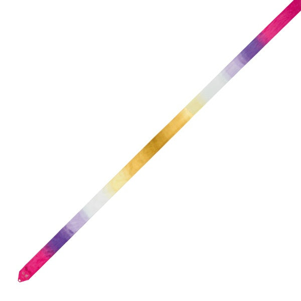 The Chacott Rhythmic Gymnastics Gradation Ribbon is a beautifully shaded ribbon designed to elevate your performance. Featuring innovative coloring that creates a stunning gradient effect, it flows softly and dynamically, adding elegance to every movement. Crafted with special weaving techniques for enhanced durability and reduced static, this FIG-approved ribbon ensures smooth, flawless execution. Perfect for both training and competition, it offers a captivating visual impact that stands out on the floor.